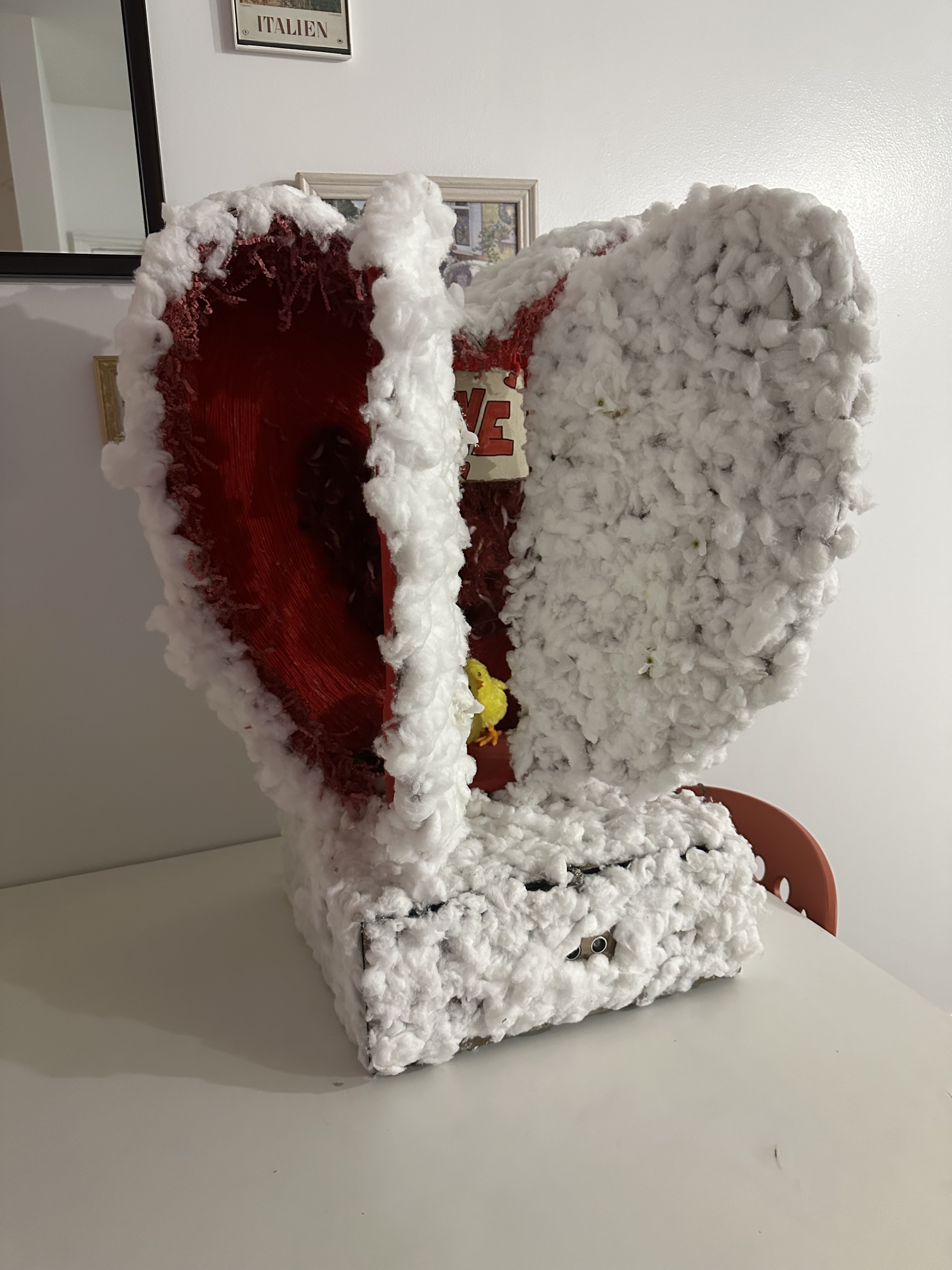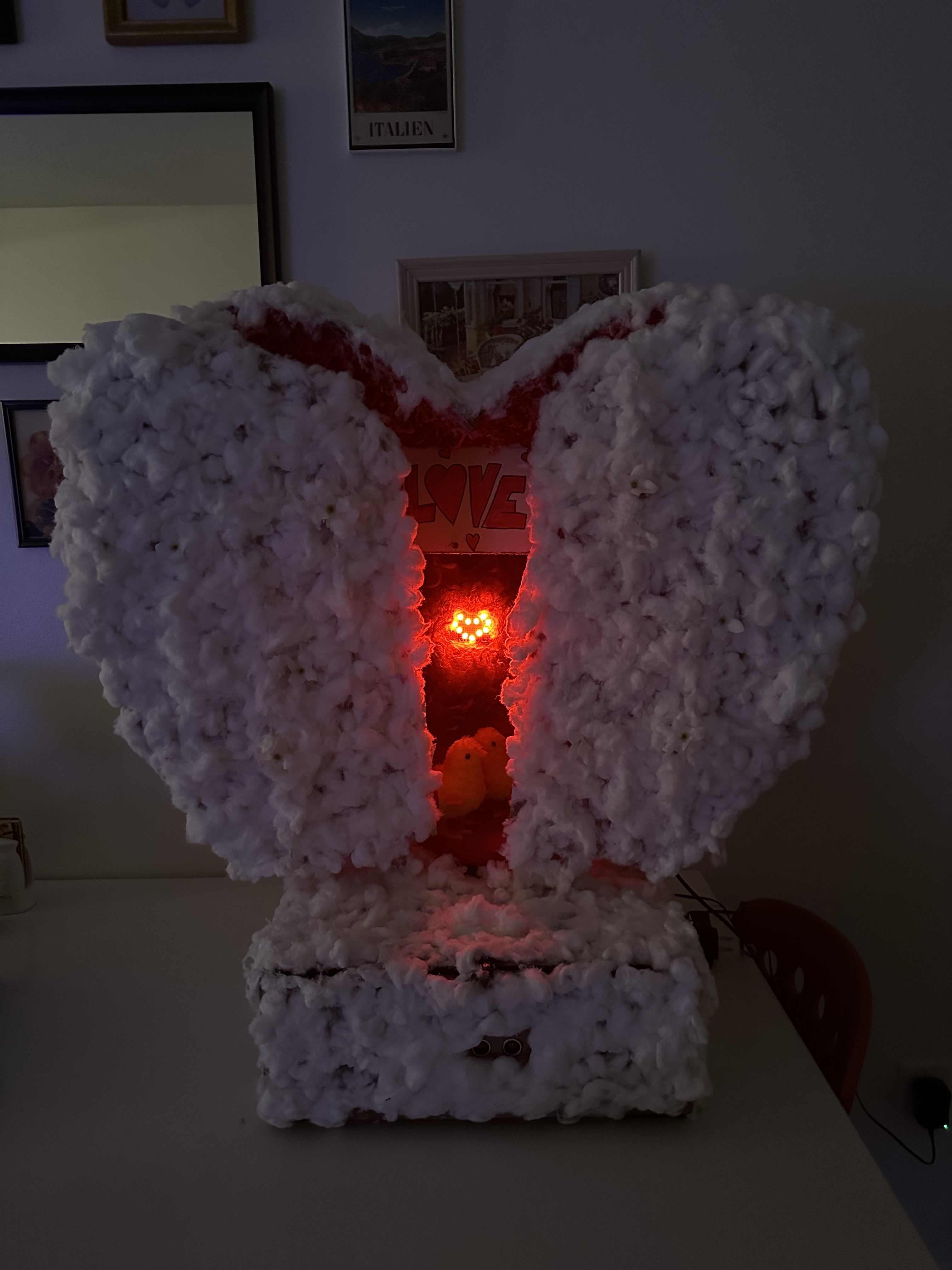 In this project brief, I had to find two unique inputs that created an output. I created a large heart that opens doors from the front as you get closer, the table inside the heart spins, and as you dim the lights, a heart lights up on the inside. This project took about 2 weeks from designing to creating the final physical product.